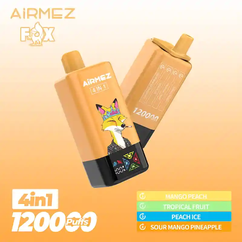 Experience the ultimate vaping with Airmez FOX 4IN1 120k disposable vape device. Featuring 4 flavors in one device, 120000 puffs, advanced mesh coil technology, Type-C charging, and a clear screen display. Perfect for beginners and advanced vapers seeking long-lasting performance and rich flavor.