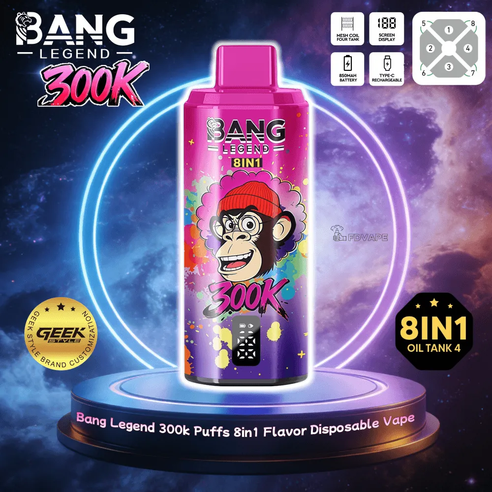 he Bang Legend 300K 8in1 Disposable Vape delivers 300,000 puffs, 40ml pre-filled e-juice, 0-5% adjustable nicotine, and 12 unique flavors. Features a smart LED screen and 8-in-1 design for ultimate convenience and longevity.