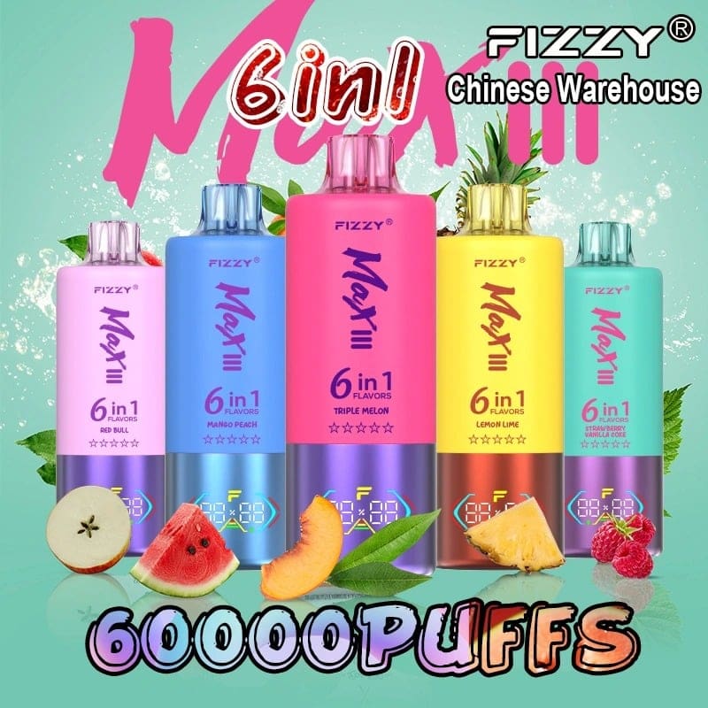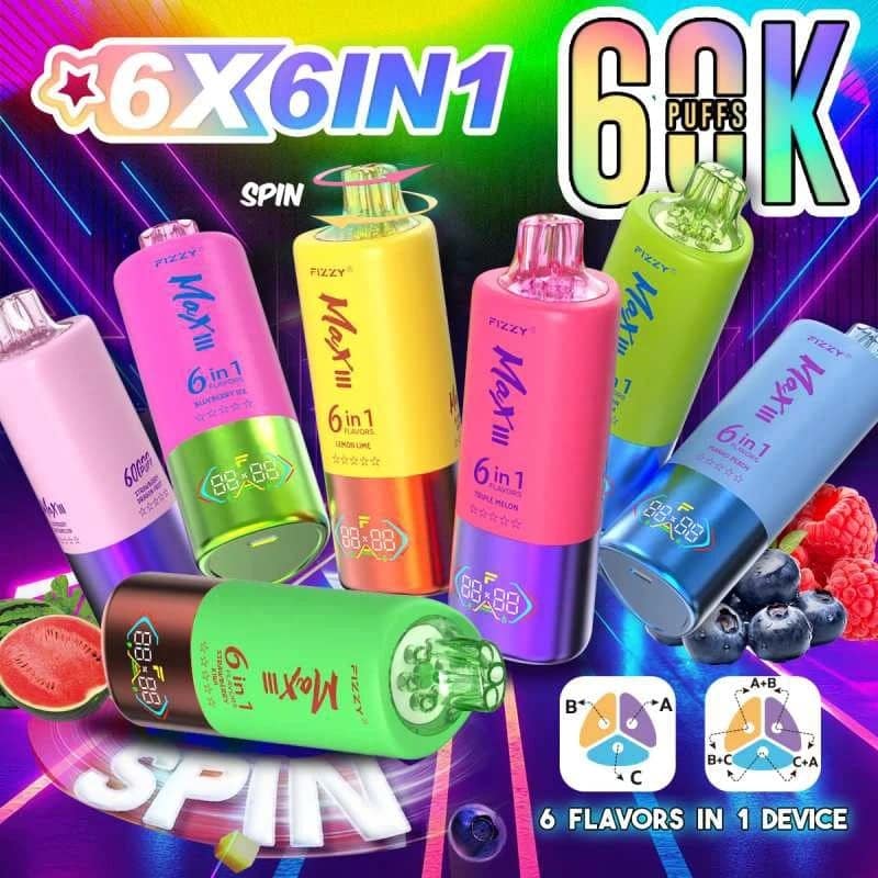 Fizzy Max 60k Puff: Triple-tank system offers 6 flavors! Vape 3 pure flavors solo or mix any 2 for 3 unique fusions. 60,000 puffs, 60mL liquid, Mesh Coil, 850mAh battery (Type-C), LED display, 2%/5% Nicotine. Ultimate flavor versatility & longevity.