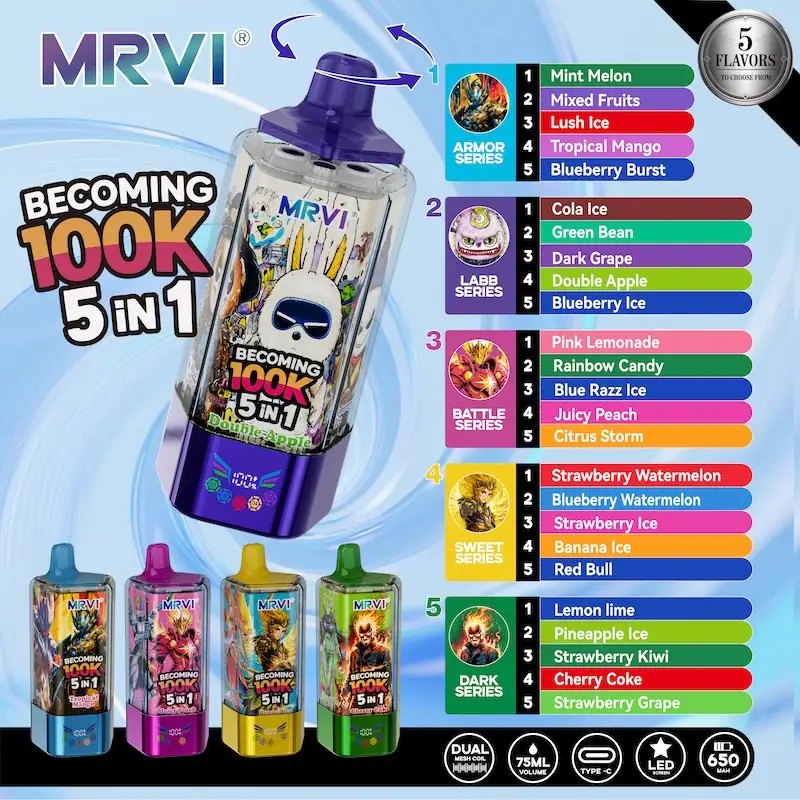 Experience the ultimate convenience with the mrvi 100k puffs 5 in 1 becoming Vape disposable vape. This 5-in-1 powerhouse device features a massive e-liquid capacity, integrated mesh coil, and USB-C rechargeability for extended use. Enjoy rich flavors and intense satisfaction without the hassle.