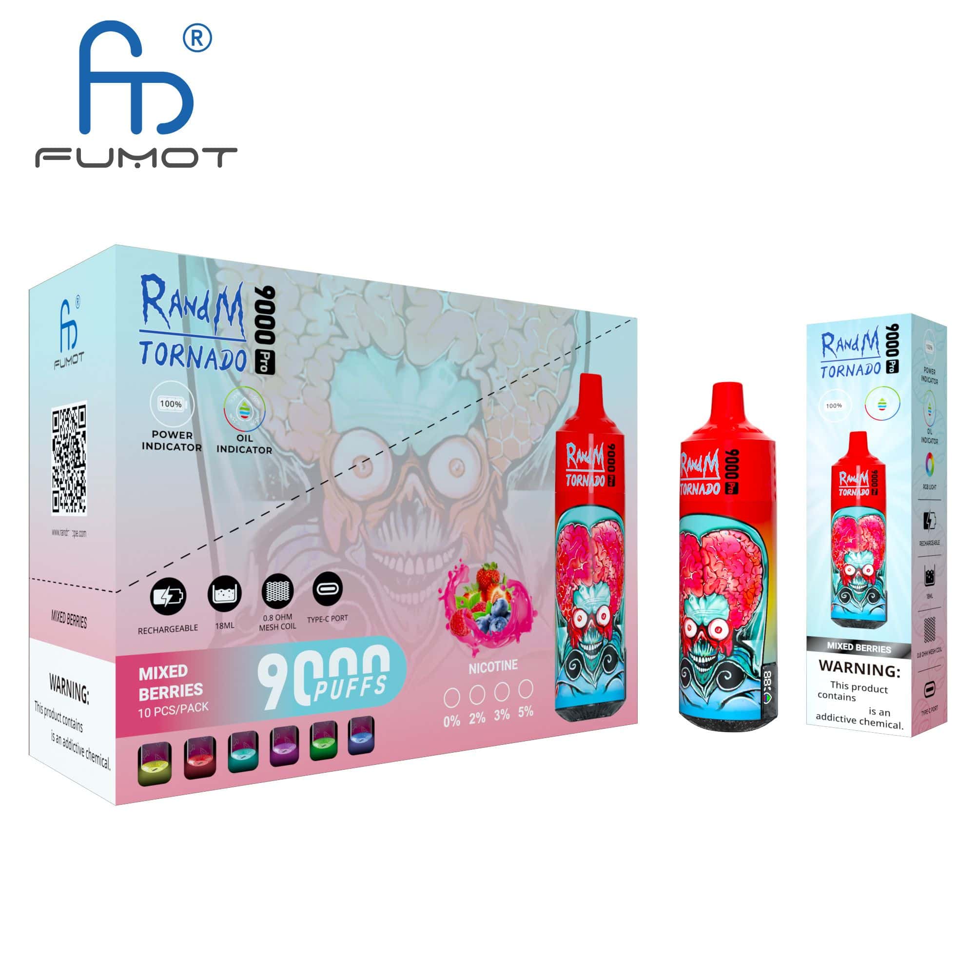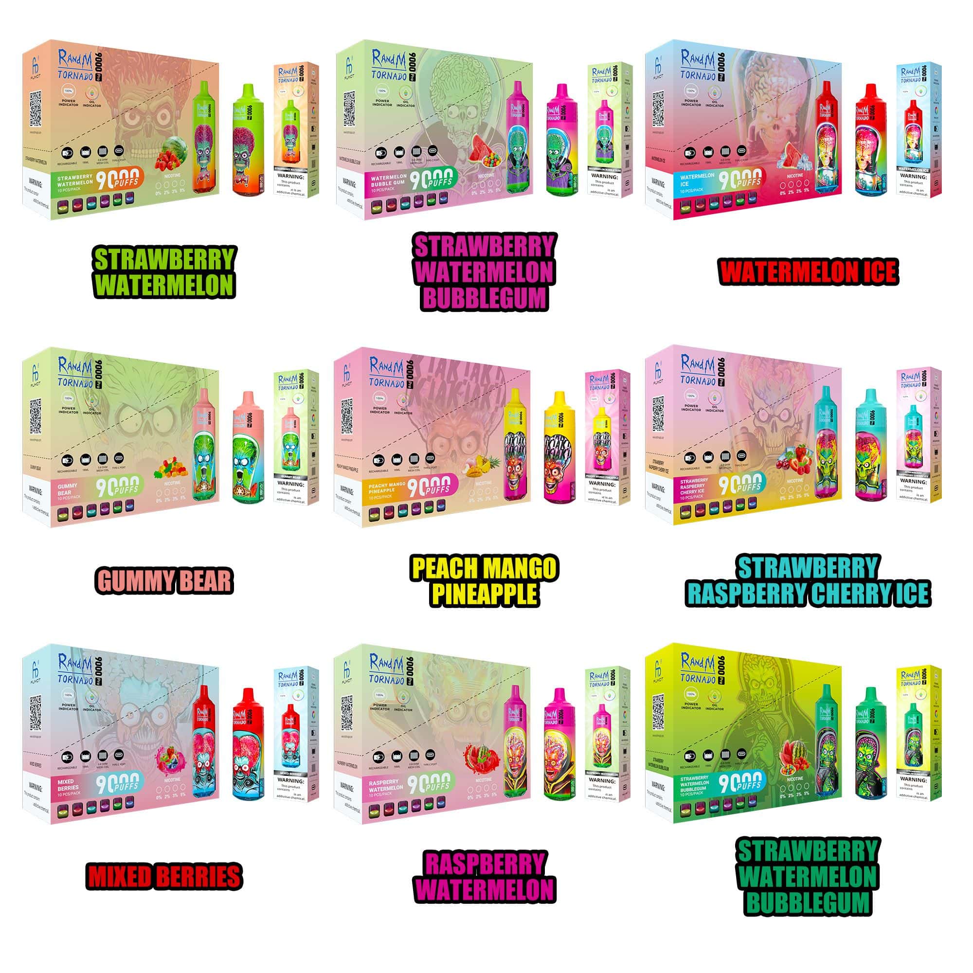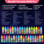 RandM Tornado 9000 PRO Puffs LED Display Disposable E-Cigarettes – a state-of-the-art and visually appealing vaping solution designed for a premium and extended experience. Crafted by RandM, the Tornado 9000 PRO series offers an impressive 9000 puffs capacity, ensuring a prolonged and satisfying vaping journey. With customizable nicotine levels of 2% and 5%, users have the flexibility to tailor their experience to their preferences.