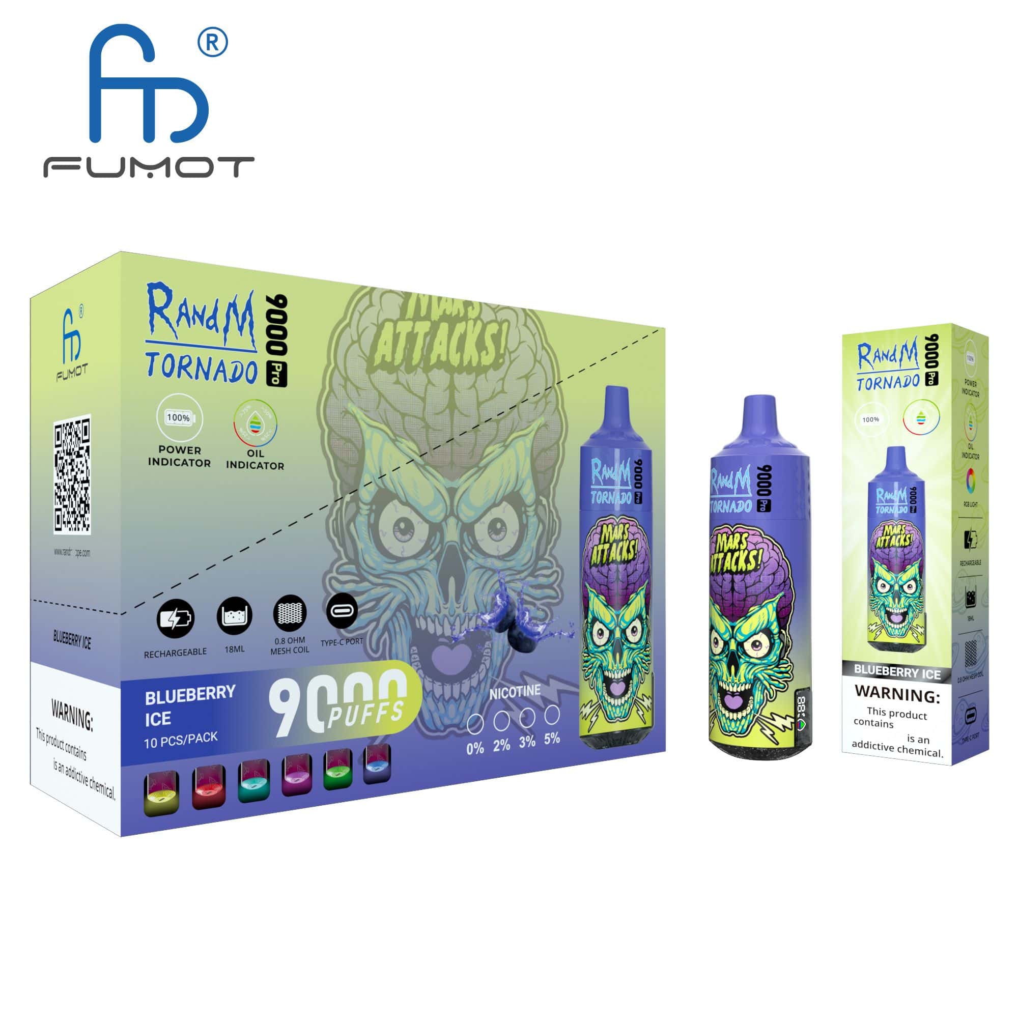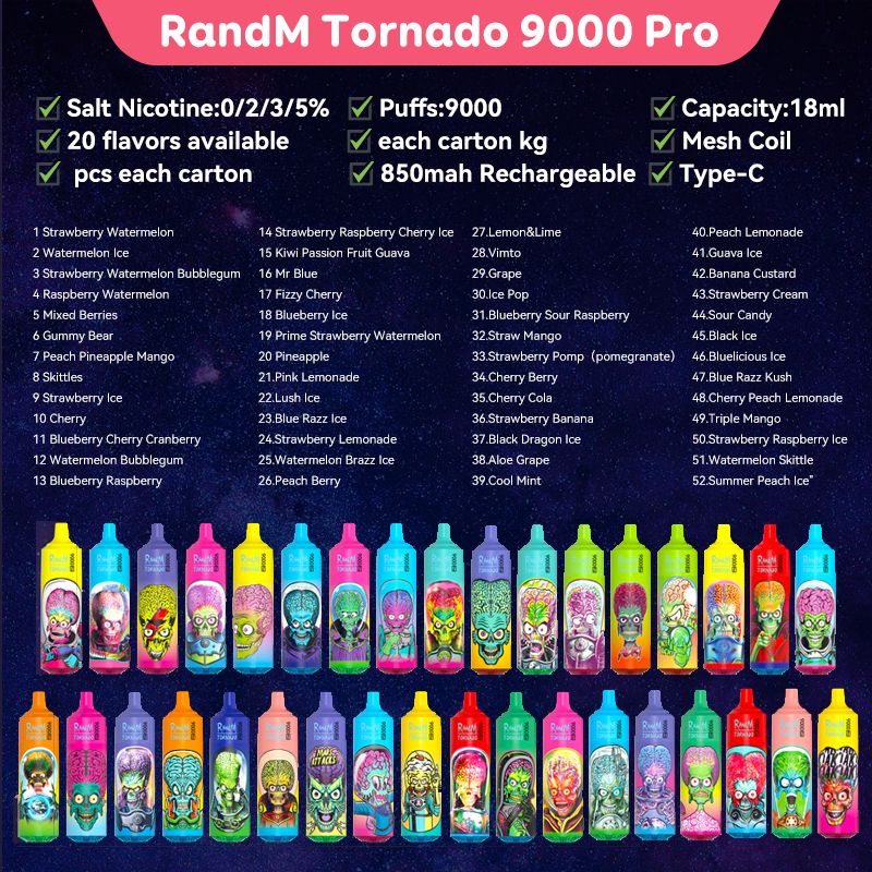 The device features a generous 18ml e-liquid capacity, equipped with a mesh coil for optimal vapor production and flavor. With an integrated 850mAh rechargeable battery and an LED display, the RandM Tornado 9000 PRO combines style, technology, and functionality for an unparalleled vaping adventure. Packaged conveniently with 10pcs in a display box, it offers a diverse selection of 52 flavors to suit various preferences.